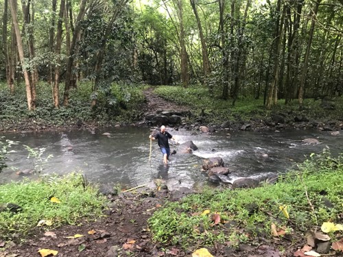 Een van de plekken waar we door het water moeten om het pad te kunnen volgen