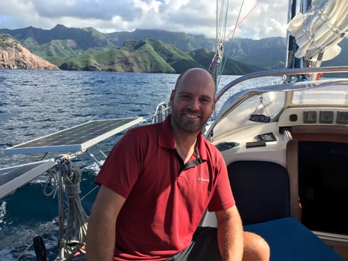 Sanne aan dek bij het binnenvaren van Taiohae Bay